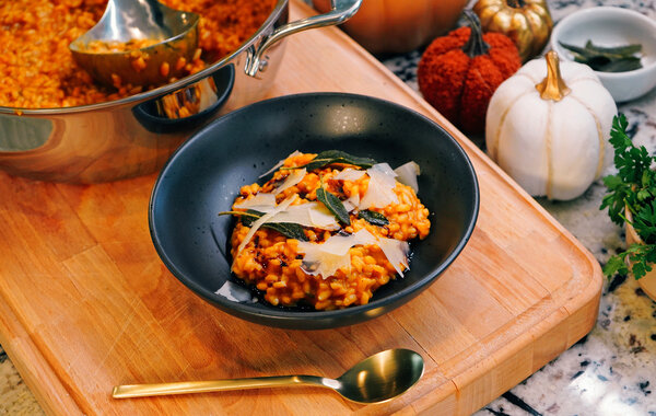 - When ready, stir in pumpkin puree, and grated Grana Padano cheese.